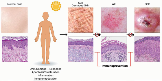Recent work from our laboratory shows that the immune checkpoint ligand PD-L1 is upregulated in epidermal keratinocytes following acute and chronic UV exposure. This finding suggests that UV-induced immune checkpoint regulation may serve as a target for preventing photocarcinogenesis. However, it is not yet known if additional UV-responsive immune-related markers are also induced early in skin carcinogenesis and whether they can be targeted for prevention interventions. Fig 1. 'Targeted Immunoprevention for Non-Melanoma Skin Cancer' UG3/UH3 Grant. In sun-exposed skin, topical immunoprevention harness innate and adaptive mechanisms targeting all stages of tumorigenic progression to cSCC. Top row: representative clinical images; Bottom row: H&E-stained skin sections.